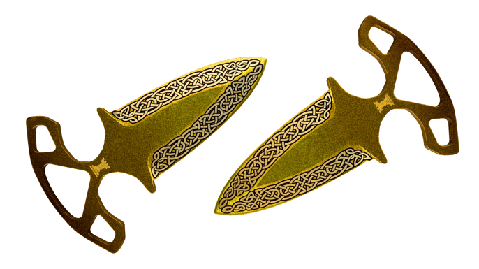 ★ Shadow Daggers | Lore (Factory New) is a regal, fantasy-inspired knife skin introduced on September 21, 2021 with the "Operation Riptide" update, appearing as a rare special item from the Dreams & Nightmares Case. These Shadow Daggers have been painted in a “Custom Paint Job” style, with the Lore finish, coating both blades in rich gold tones and intricate medieval knotwork that looks like ornate engravings pulled from an ancient manuscript. The compact twin-dagger silhouette and finger-ring grips give the set an aggressive, assassin-like feel, while the detailed filigree keeps it elegant and high-end. In Factory New condition, the finish looks pristine: no visible scuffs on the edges, no scratches across the gold panels, and no dulling, so the engraving stays crisp, the sheen remains vivid, and the pair looks truly collectible.