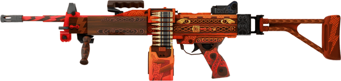 Negev | Mjölnir (Recién fabricado) es una interpretación mítica de la LMG, forjada dentro de la Norse Collection lanzada durante la Operation Shattered Web en noviembre de 2019. Ha sido pintada con un “trabajo de pintura personalizado” con el acabado Mjölnir: intrincados nudos, bandas rúnicas y motivos del martillo de Thor cubren el cajón, la tapa del alimentador, la culata y el enorme tambor. Tonos naranja quemado y rojo brasa resplandecen sobre paneles oscuros de apariencia férrea, mientras patrones trenzados recorren el guardacañón y el asa de transporte para un look de reliquia totalmente envuelto. En estado Recién fabricado, las líneas ornamentales se ven afiladas y limpias: sin desgaste en los labios del cargador, el freno de boca o la carcasa de la mira, y los degradados cobrizos se mantienen vívidos y sin marcas.