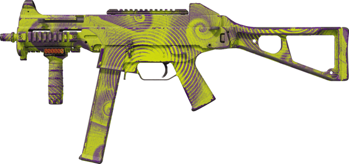 La UMP-45 | Delusion luce una apariencia llamativa con su cuerpo púrpura vibrante, adornado con un diseño translúcido cautivador que incluye espirales vivas y remolinos fantasiosos en un brillante tono verde.