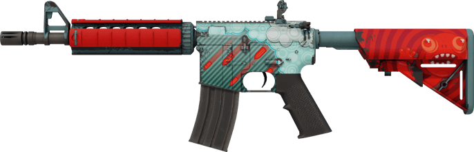 StatTrak™ M4A4 | Bullet Rain (新品同様) は、2014年7月10日に「Summer is heating up」アップデートで登場し、eSports 2014 Summer Case から入手できる The eSports 2014 Summer Collection のライフルスキンです。この M4A4 は 「カスタムペイント」スタイルの Bullet Rain で、強いコントラストを効かせた大胆なカスタム感が特徴。ボディにはティールの斜めストライプとデフォルメされた雲が描かれ、雨粒の代わりに鮮烈な赤い弾丸がレシーバーへ降り注ぐデザインで、さらに鮮やかな赤の家具パーツが全体のインパクトを増幅します。新品同様の状態では、そのスキンはほとんど元の美しさを保っており、ごくわずかでほとんど目立たない摩耗しか見られません。StatTrak™スキンでは、武器に内蔵されたデジタルキルカウンターが搭載されており、撃破した敵の数を記録します。