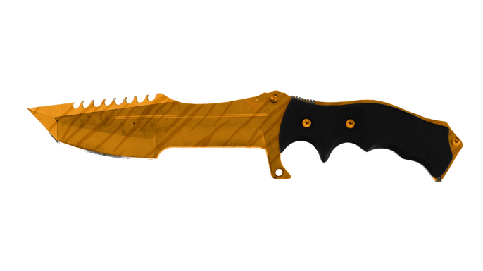 ★ 獵刀 | 虎牙 (全新出廠) 是一款高端刀具皮膚,於 2017 年 3 月 15 日推出,隨 Spectrum Case 發布(後續也可在 Spectrum 2 Case 中取得),並與「Take a trip to the Canals」更新同期登場。它採用陽極多彩工藝並使用 虎牙 飾面:刀刃覆上亮澤金色塗層,再疊加銳利雕刻感的棕色虎紋條紋,既兇狠又奢華。乾淨的深色握柄與粗獷的 獵 輪廓讓視覺焦點集中在明亮、反光的刀刃上,而些微的圖案變化也可能讓條紋位置略有不同。全新出廠狀態下,外觀完美:沒有可見擦痕、刮傷或刃口暗淡,鏡面光澤保持乾淨,虎紋線條依舊清晰。
