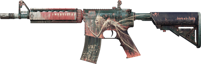 M4A4 | 牙仙(重度磨損)是一把帶有陰森童話風格的反恐精英步槍,來自 The Fracture Collection,於2020年8月隨 Fracture Case 推出。由社群創作者組合 2minds 設計,融合陰暗的綠色、黑色與血紅色,搭配詭異的牙仙主題、散落的牙齒與縫線布料細節。這把 M4A4 採用「自訂塗裝」風格,牙仙 塗裝展示門牙、臼齒與陰森的藝術圖案,覆蓋整個機匣、護木與槍托。在重度磨損的狀態下,這款皮膚的表面出現明顯的刮痕、褪色與擦痕。